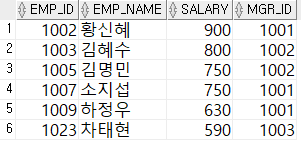 - 관리자의 사원 번호가 1001, 1002, 1003인 모든 사원의 사원 번호, 이름, 급여 및 관리자의 사원 번호를 검색