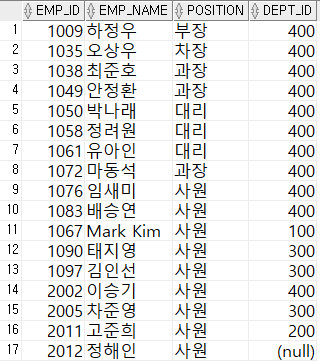 WHERE position = '사원' OR dept_id = 400;