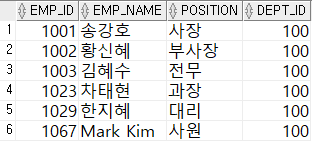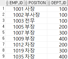 - 100번 부서에서 근무하는 사원에 대한 사번, 이름, 직급, 부서번호를 나열