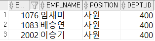 - 직급이 '사원'이고 400번 부서에 속하는 사원을 검색