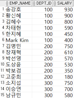 - 이름, 부서번호, 급여를 출력하는데 부서번호를 기준으로 오름차순 정렬하고 동일 부서 내에서는 급여가 많은 순서대로 내림차순 정렬한 결과 출력
