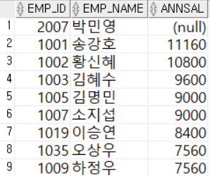 - 사원번호, 이름, 연봉을 조회하는데 별칭인 연봉을 기준으로 내림차순 정렬
