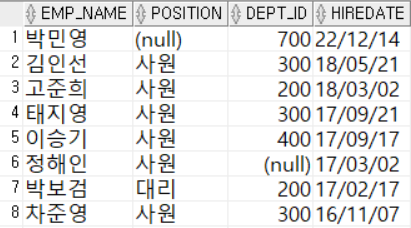 SELECT emp_name, position, dept_id, hiredate