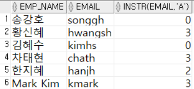 - 100번 부서 사원의 email에 소문자 'a'가 포함되는지 알아보기, 'a'가 있으면 위치값이, 없으면 0을 반환