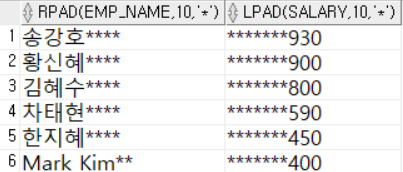 SELECT RPAD(emp_name, 10, '*'), LPAD(salary, 10, '*')