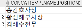 - CONCAT(char1, char2) : 지정된 두 문자를 결합