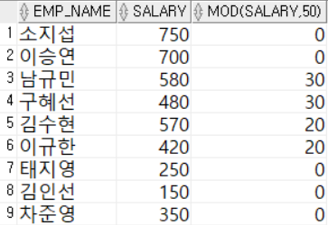 SELECT emp_name, salary, MOD(salary, 50)