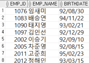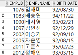 - 1992년 1월 1일 이후에 태어난 사원을 검색하고자 할 때 다음과 같이 사용자가 지정한 날짜가 현재의 날짜 형식과 맞지않아서 오류가 발생한다.