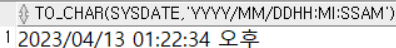 - SYSDATE와 TO_CHAR 함수를 사용하여 오늘 날짜를 'YYYY/MM/DD HH:MI:SS AM'의 형식으로 표시