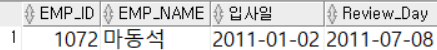 - 입사 후 6개월 경과 후 첫 번째 돌아오는 금요일이 사원의 인턴기간이 만료되고 채용 여부가 결정되는 시기로 정해져 있다. 2011년에 입사한 사원의 인턴기간 만료일이 언 제인지 날짜 함수를 중첩해서 알아본다. 또한 출력되는 날짜의 형식은 YYYY-MM-DD 형식이어야 한다.