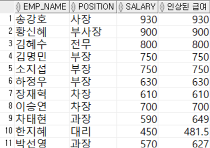 - POSITION이 사원이면 5% 인상된 급여, 대리이면 7% 인상, 과장이면 10% 인상된 급여를 반환, 그 외의 직급에 대해서는 인상되지 않은 급여를 반환
