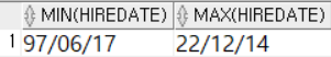 SELECT MIN(hiredate), MAX(hiredate)