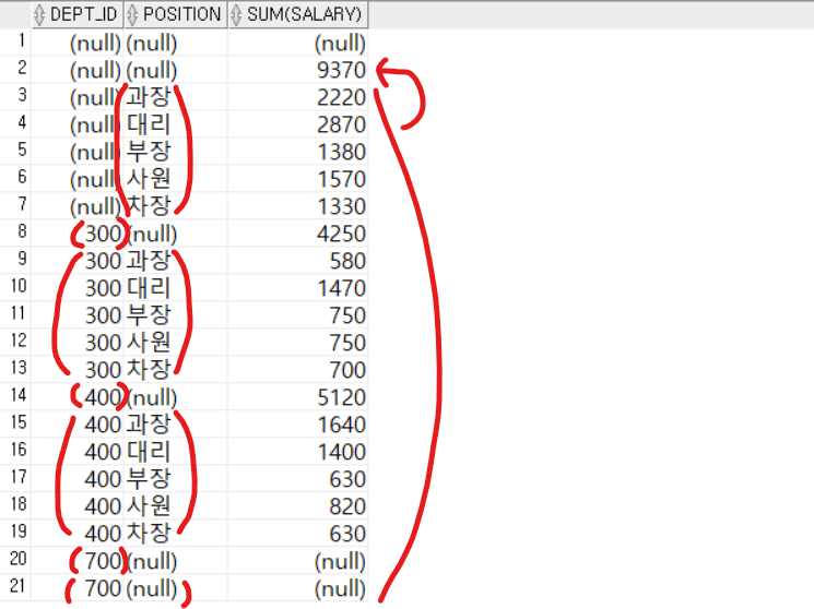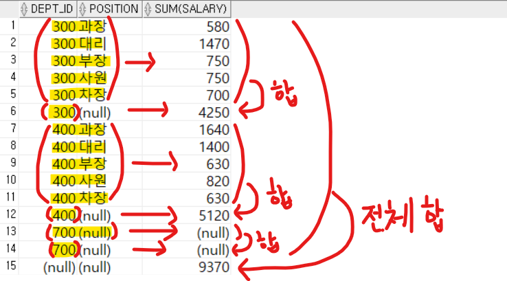- GROUP BY ROLLUP (dept_id, position)에는 다음의 결과가 함께 표시