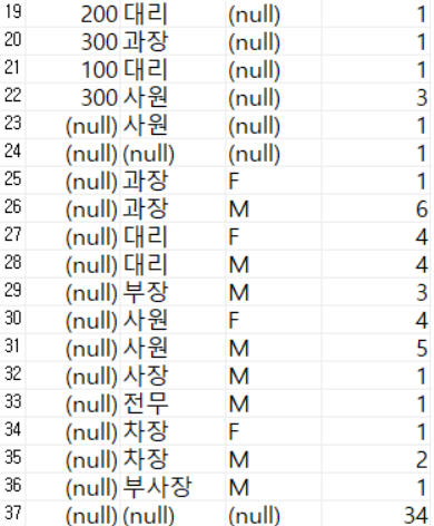 - → ROLLUP(dept_id, gender, position)의 결과에서 GROUP BY(dept_id, gender)의 결과 제외