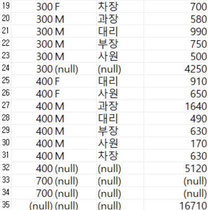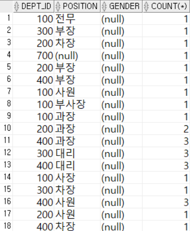- ROLLUP(dept_id, (gender, position)) 에는 다음의 결과가 함께 표시