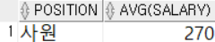 - HAVING 절에 서브 쿼리를 사용하여 회사의 업무 중 평균 급여가 가장 낮은 직급과 그 평균 급여를 반환