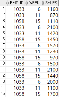 SELECT emp_id, week_id, mon_sales, tue_sales, wed_sales, thur_sales, fri_sales