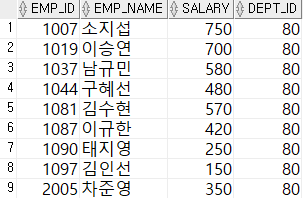 - emp_id가 1087인 행의 salary는 emp_id가 1038인 사원의 salary로 설정 (570)