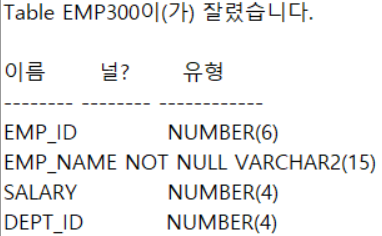 - emp300 테이블을 TRUNCATE 한 후 모든 행은 삭제되고 테이블 구조만 남아 있는 것을 확인