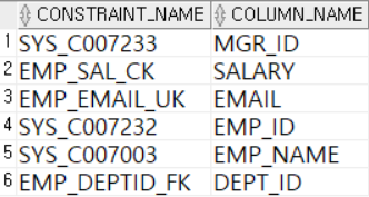 - USER_CONS_COLUMNS를 조회하여 제약 조건이 정의된 열 이름을 조회