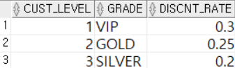 - 고객 등급별 등급 이름과 할인율을 저장하고 있는 cust_grade 테이블의 내용을 확인, 이 테이블은 cust_level 열에 PRIMARY KEY가 정의되어 있다.