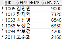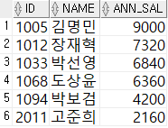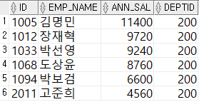 - 200번 부서의 모든 사원에 대해 별칭이 id, name, ann_sal인 뷰를 생성