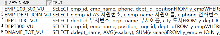 - sal_vu200은 뷰를 작성한 쿼리 문을 실행하기 때문에 기존 테이블 y_emp를 바꾸면 바뀐 값이 나오게 된다.