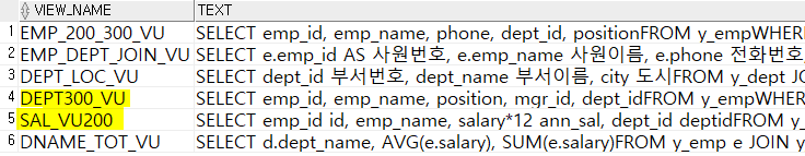 - user_views를 쿼리하여 dept300_vu와 sal_vu200 뷰에 대한 정보를 확인
