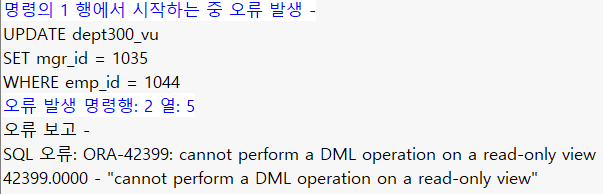 - 읽기 전용 뷰에 DML을 시도하면 오류