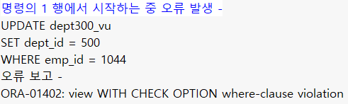 - dept300_vu 뷰를 통해 부서 번호 변경을 시도하면 WITH CKECK OPTION 제약 조건에 위배되어 오류