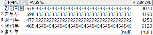 - 부서 이름 별 총 급여 및 평균 급여를 표시하는 복합 뷰, 뷰의 열이 함수나 표현식으로부터 파생된 경우에는 반드시 별칭이 필요